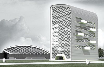 Zaprojektowano wielofunkcyjną halę sportową z pomieszczeniami i funkcjami towarzyszącymi, w części zapleczowej oraz w przestrzeni pod trybunami stałymi, główną o 1 kondygnacji nadziemnej oraz tenisową o 2 kondygnacjach nadziemnych - obie połączone łącznikiem i przekryte dachami łukowymi.